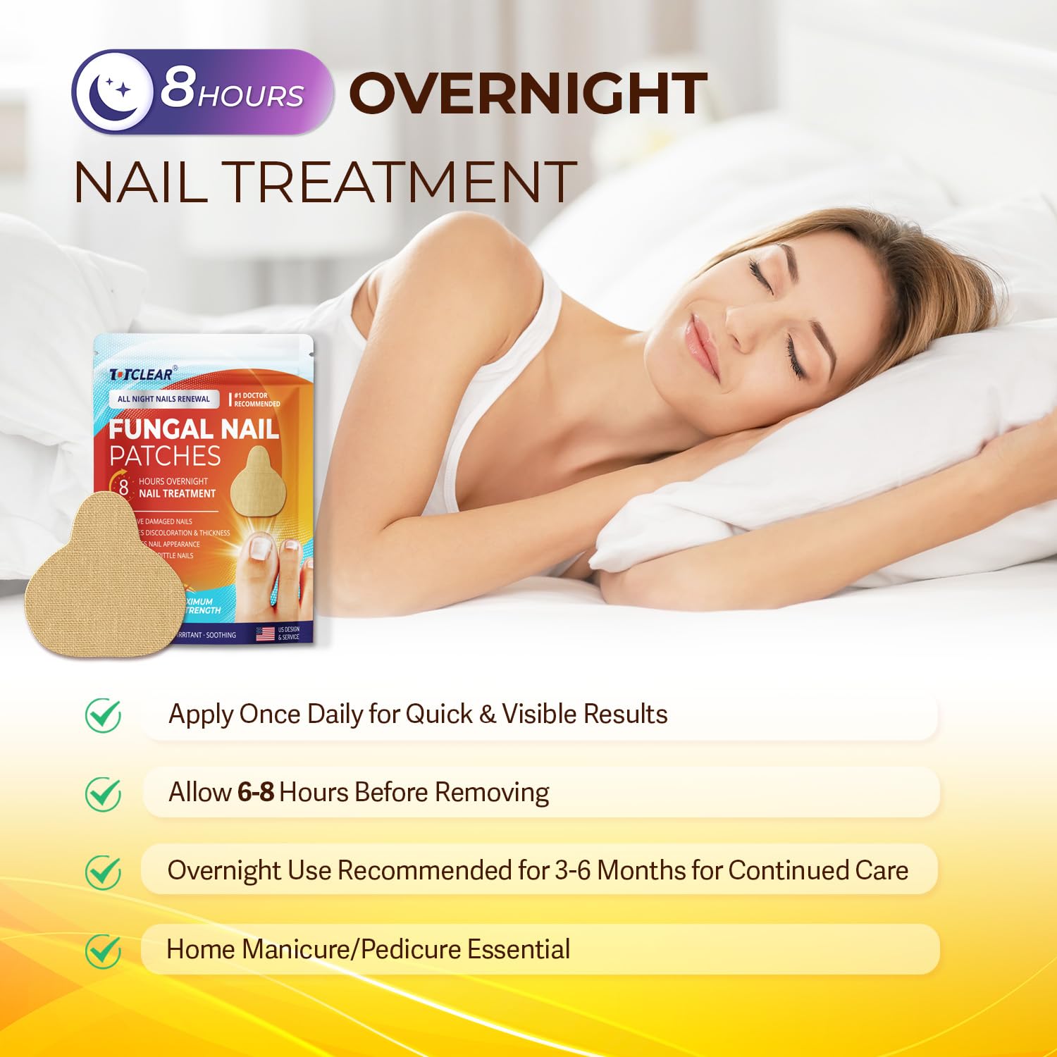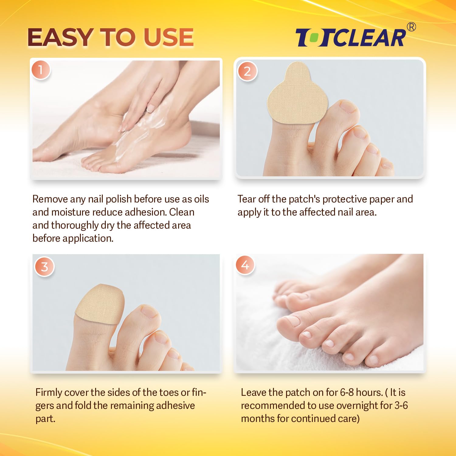 π Effective All Night - TOTCLEAR Nighttime Fungus Nail Patches include 21 advanced Nail Improvement Patches that are specifically designed to target nail damage and provide intensive foot improvement. TOTCLEAR Fungus Nail Patches provide extra strength nail fungus for toenails and work when you are sleeping for up to 8 hours, apply this nail improvement patch once daily for 6-8 hours. It is recommended to be applied before bedtime for 3-6 months for continued nail improvement.